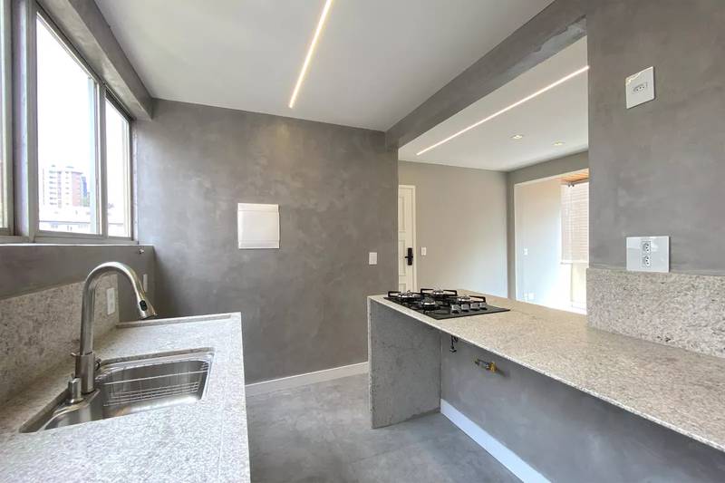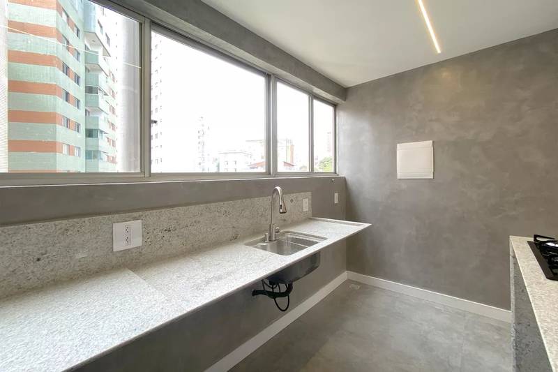 Cozinha espaçosa com bancada em granito, conjugada com a área de serviço com tanque