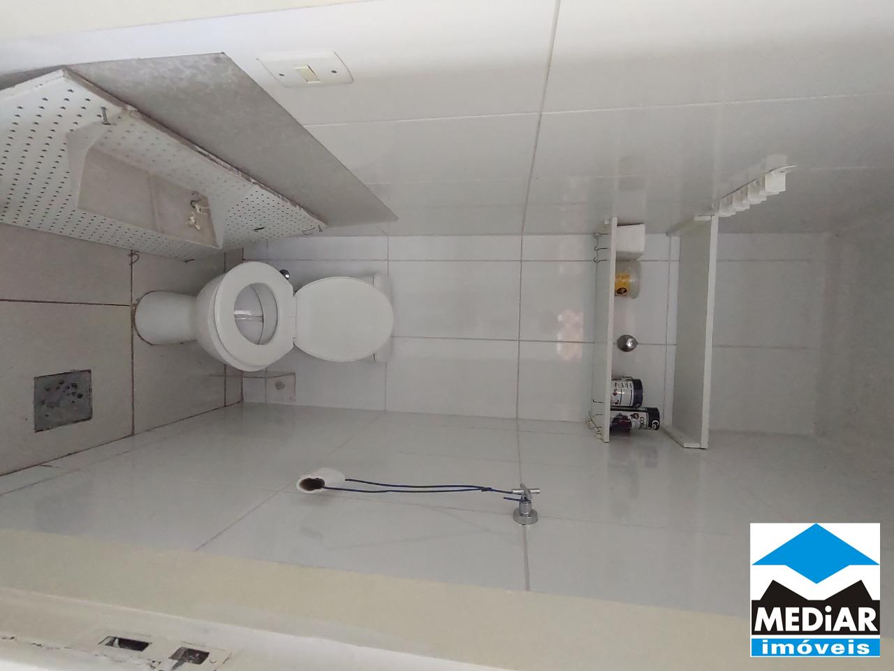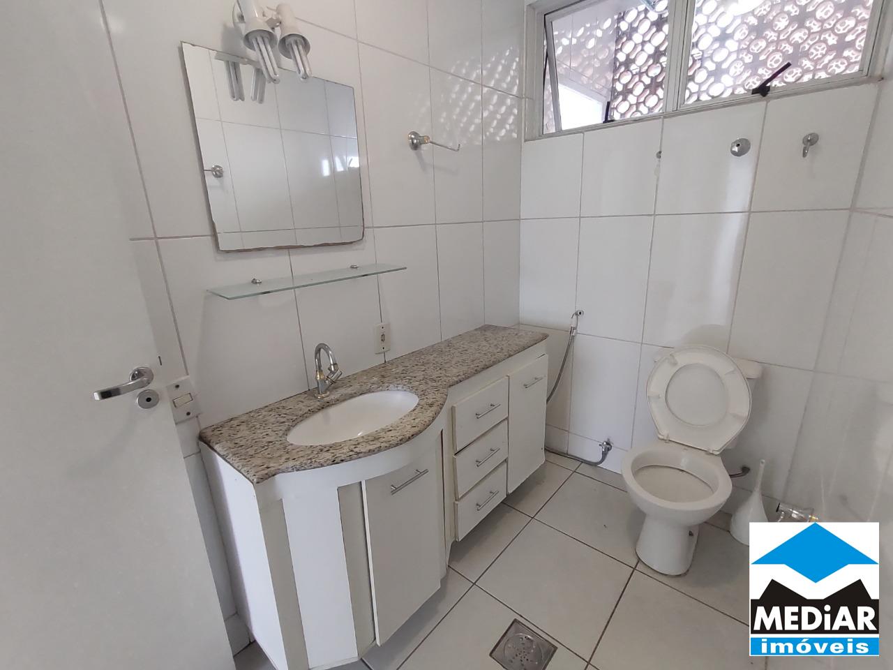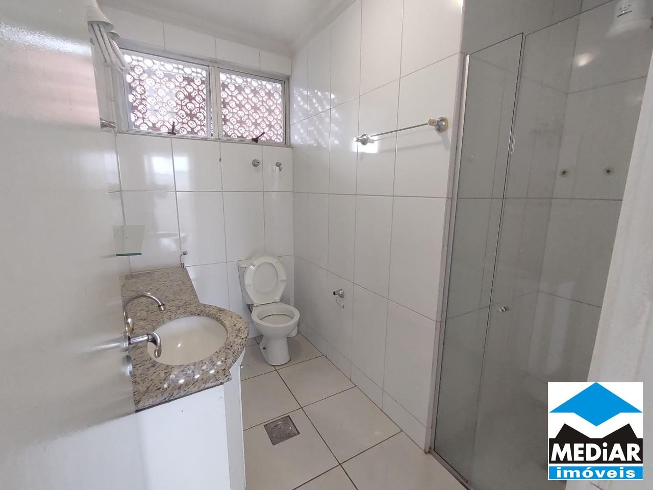 Banheiro social com bancada em granito, armário e box em vidro temperado