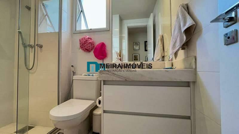 Banheiro social com iluminação planejada, bancada em granito, armários, espelho e box em blindex