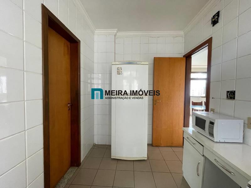 Cozinha ampla e arejada, com armários, piso em cerâmica, armários sob bancadas em mármore.