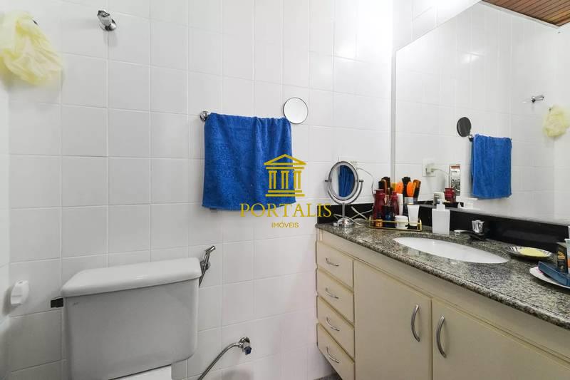 Banheiro social com pia em cuba de apoio, espelho, armários e box em blindex