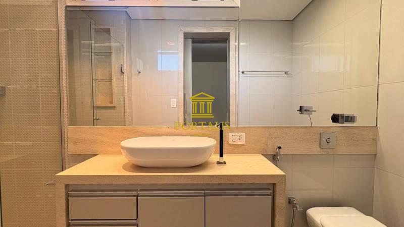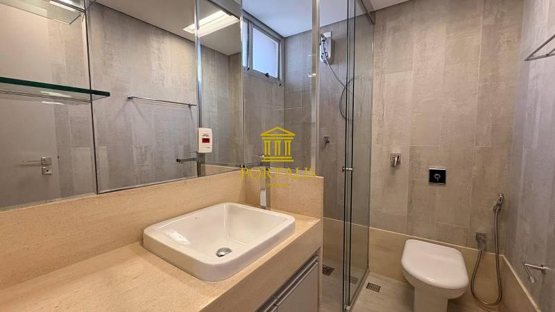 3 quartos espaçosos, todos com armários planejados, iluminação planejada e piso vinílico de madeira, sendo uma suíte com bancada em mármore, pia em cuba de apoio, espelho e box em blindex