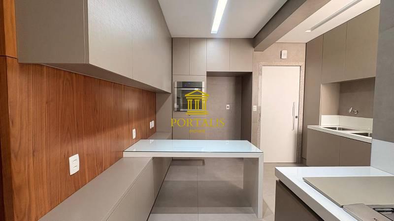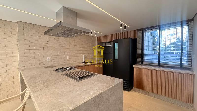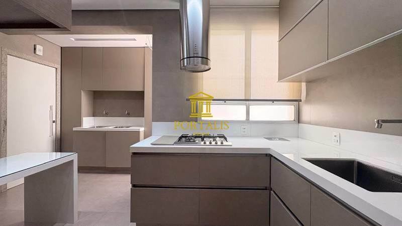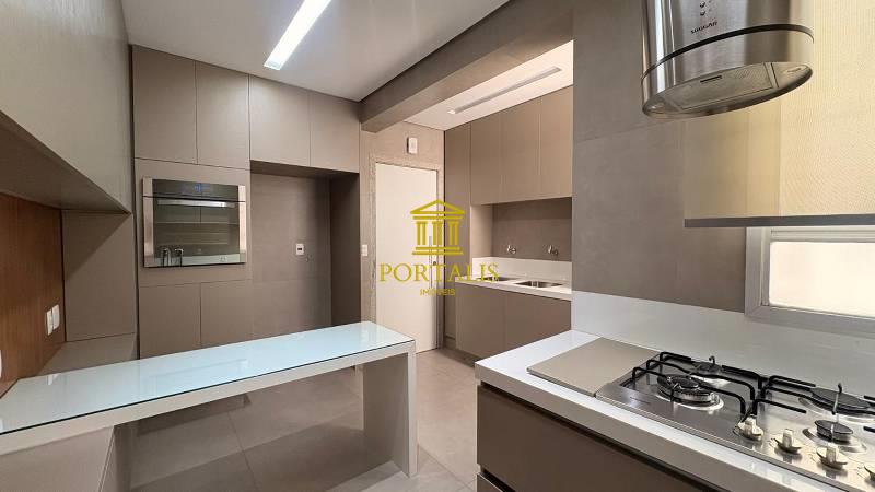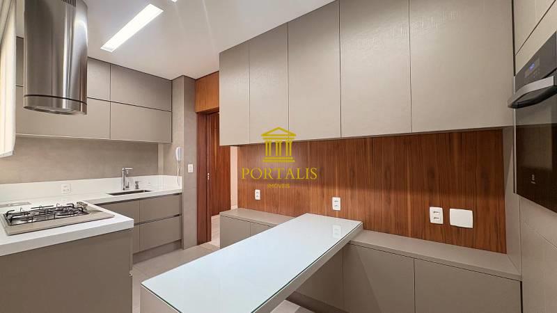 Cozinha espaçosa e funcional, com piso em porcelanato, coifa, forno embutido, armários planejados e bancada em granito