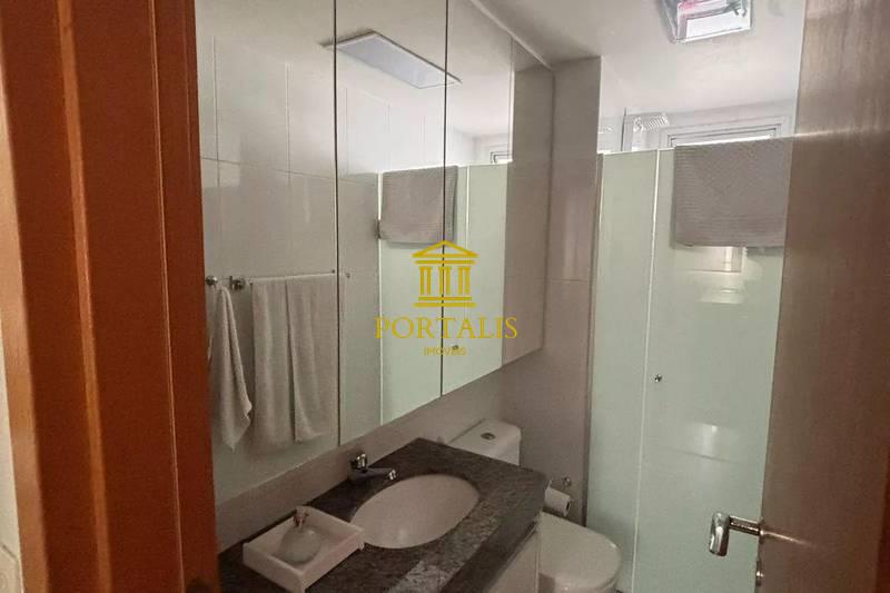 Banheiro social com bancada em granito, espelho, armários e box em blindex
