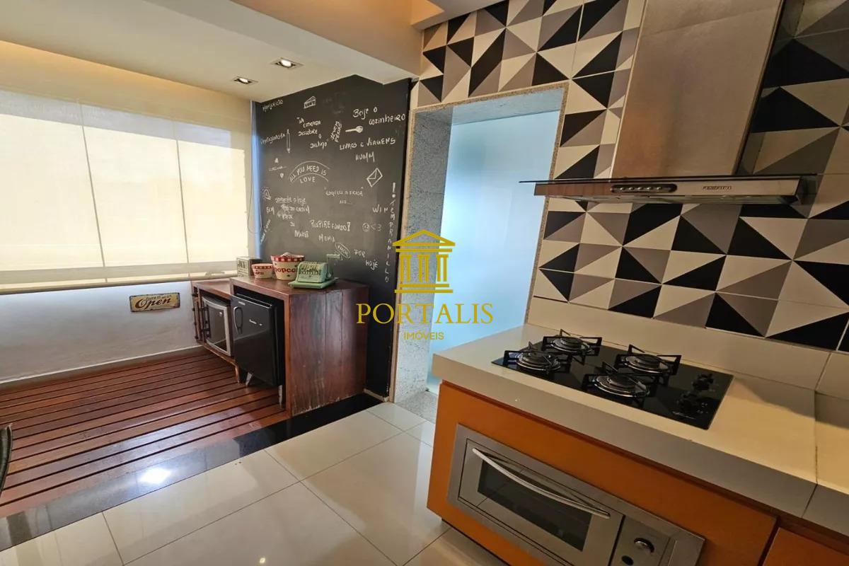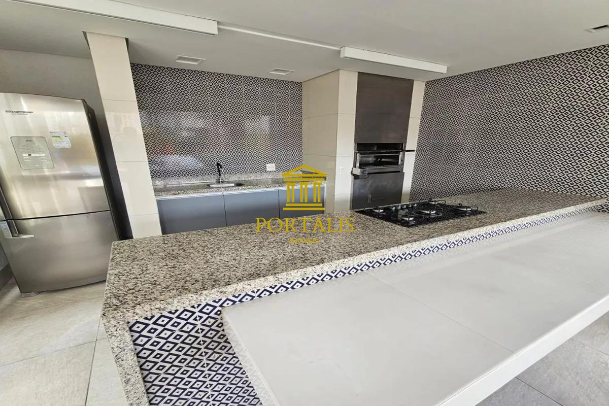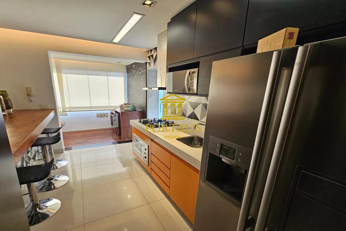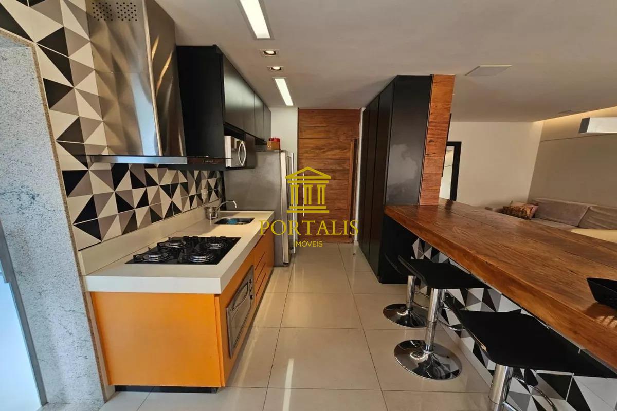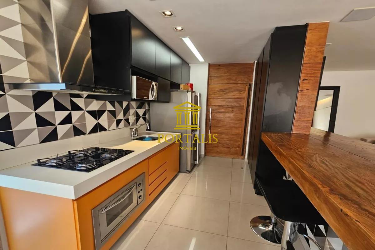 Cozinha espaçosa e funcional, com piso em porcelanato, coifa, armários, iluminação planejada e bancada americana em madeira