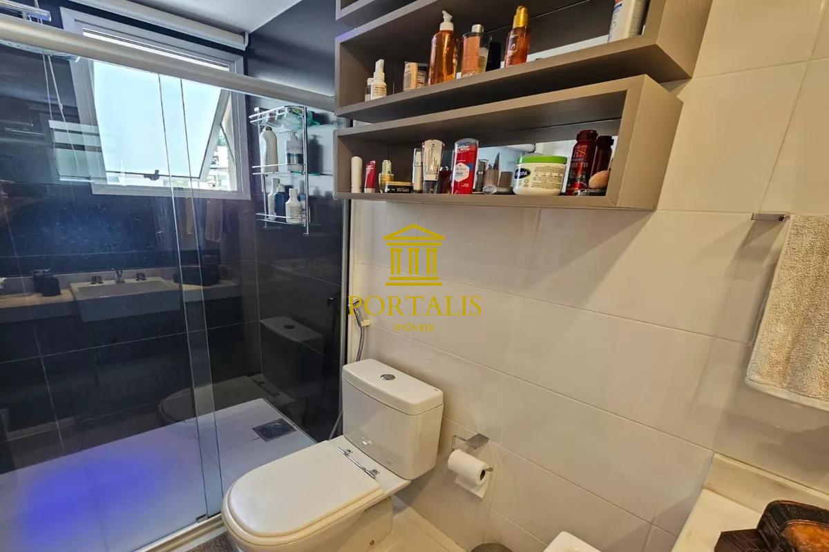 3 quartos espaçosos, todos com armários, piso vinílico de madeira e iluminação planejada, sendo uma suíte com bancada em mármore, pia em cuba de apoio, espelho, armários e box em blindex