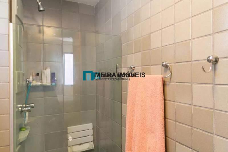 Banheiro social com bancada em granito, espelho, armários e box em blindex