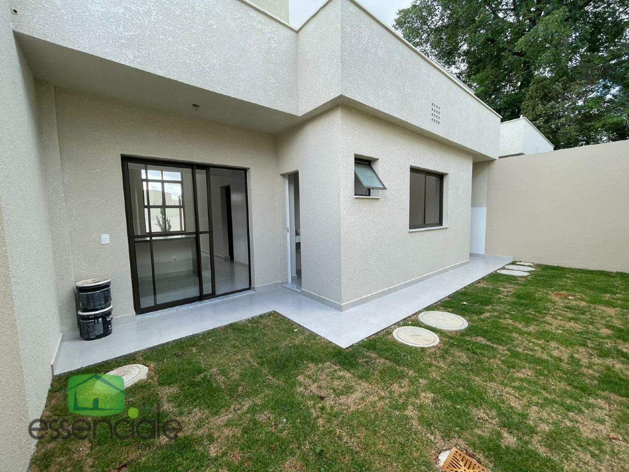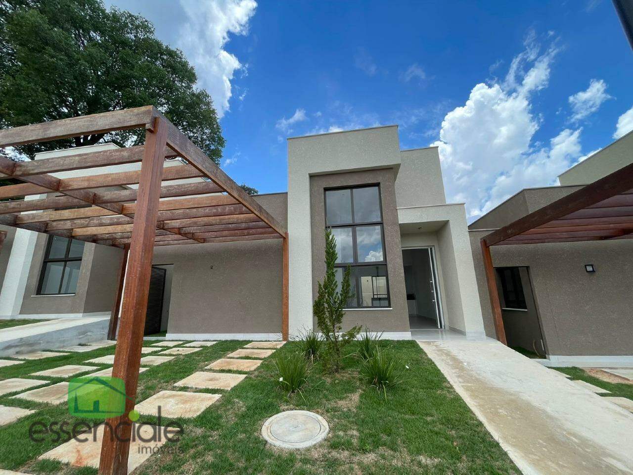 Linda casa em condomínio à venda em Contagem, com 3 quartos, sendo 1 suíte, banho social, sala com pé direito duplo, sala de TV, sala de jantar e cozinha americana com conceito aberto. A propriedade ainda oferece área de serviço externa, quintal com gramado, água individualizada e 2 vagas paralelas sob pergolado.