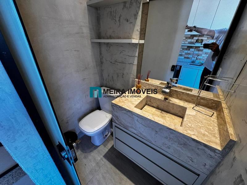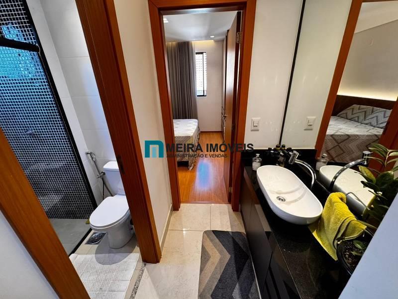 Banhos das suítes com bancada em granito, armário, espelho e box em blindex.
