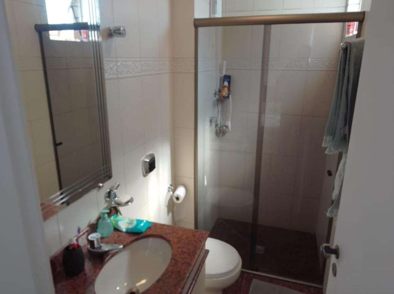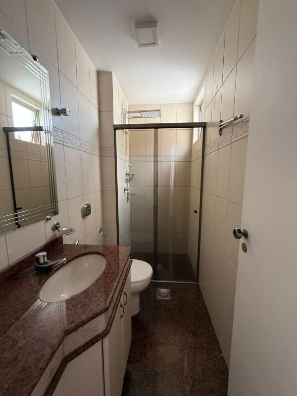 Suíte e banho social com box em vidro e armários