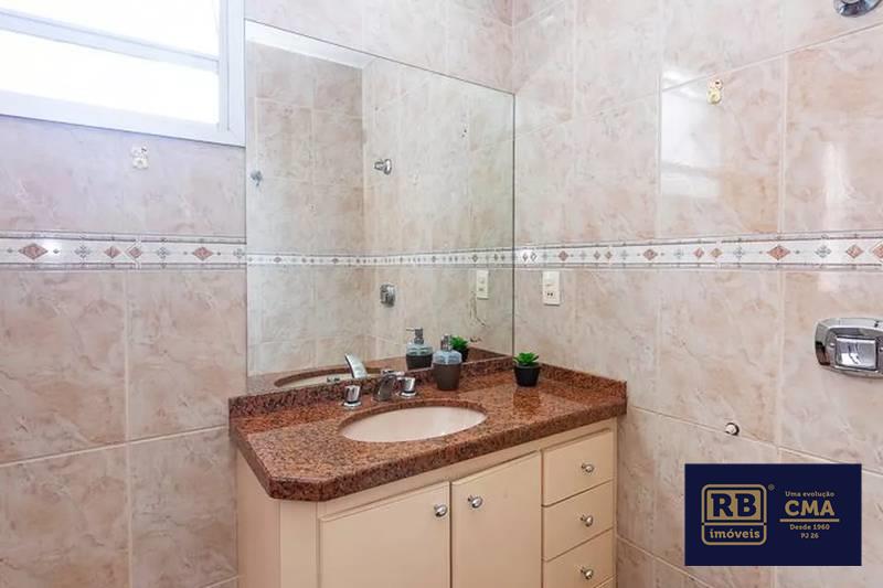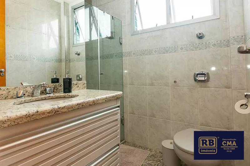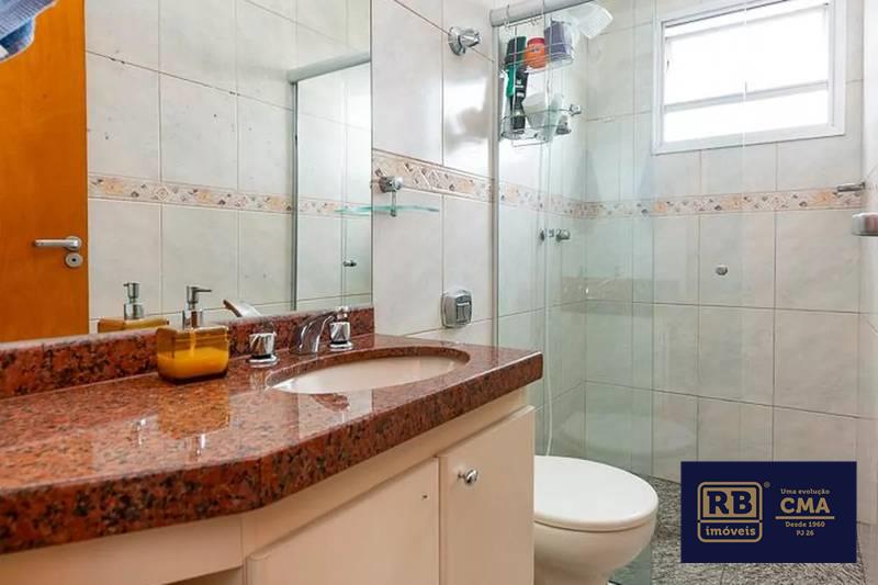 Banheiro social com espelho, bancada em granito, armários e box em blindex